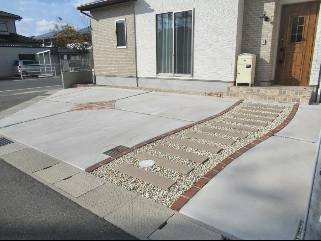 枕木調コンクリートとレンガのアプローチ 倉敷市 大内 新築住宅の外構工事です